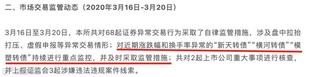 3月20日,沪深交易所均表示,将转债交易情况纳入重点监控,对于异常交易行为及时采取监管措施。