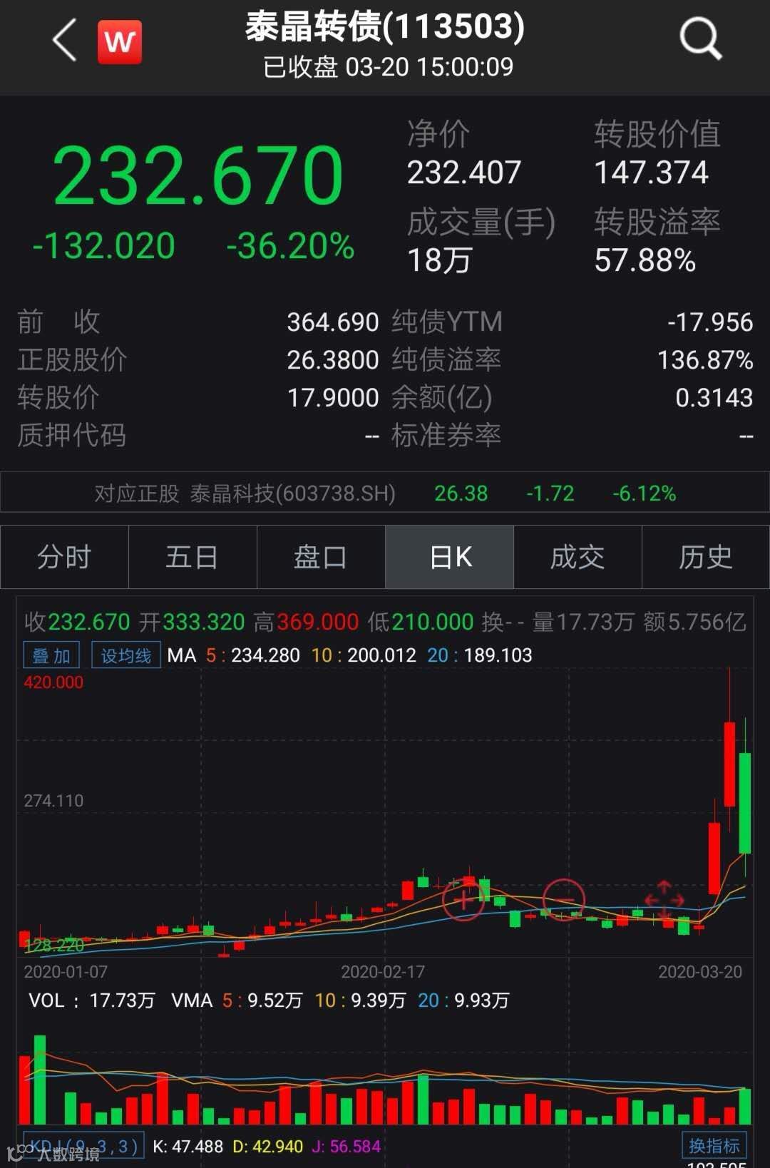 而就在前两天被爆炒的泰晶转债,20日当天暴跌36.20%,在最后一小时交易时间内,跌势较猛,两度触发临停。最终收盘价233元。据了解,18日~19日泰晶转债涨幅依次为65.28%、38.48%。尤其是19日,盘中价格一度爬到420元的高点,令投资者惊呼。