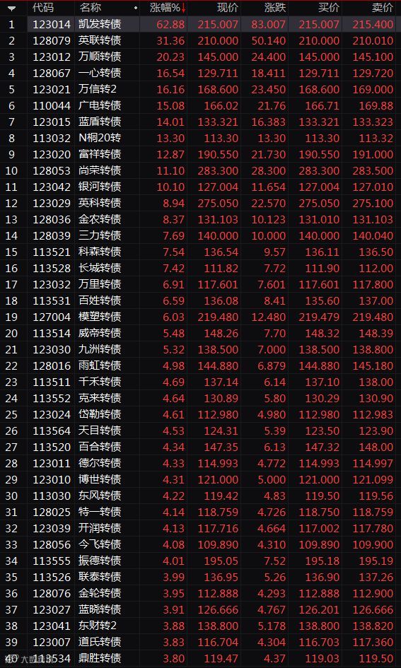 3月20日可转债热度依旧,凯发转债当天涨幅62.88%,盘中一度上涨83.11%,最终以215元收盘。换手率达到33倍。涨幅第二的为英联转债,收涨31.36%;第三位是万顺转债,收涨20.23%。