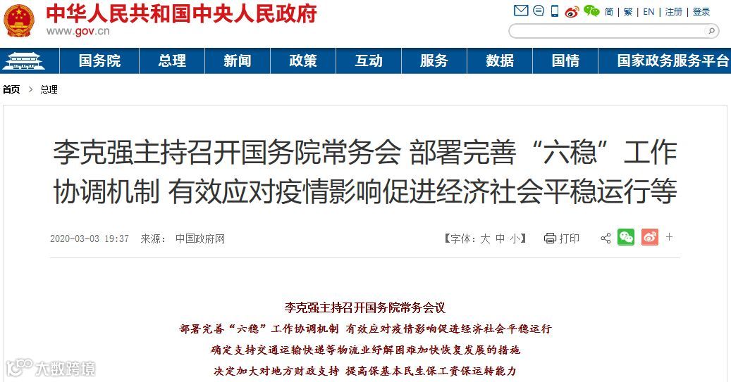国务院总理李克强3月3日主持召开国务院常务会议,部署完善“六稳”工作协调机制,有效应对疫情影响促进经济社会平稳运行;确定支持交通运输、快递等物流业纾解困难加快恢复发展的措施;决定加大对地方财政支持,提高保基本民生保工资保运转能力。