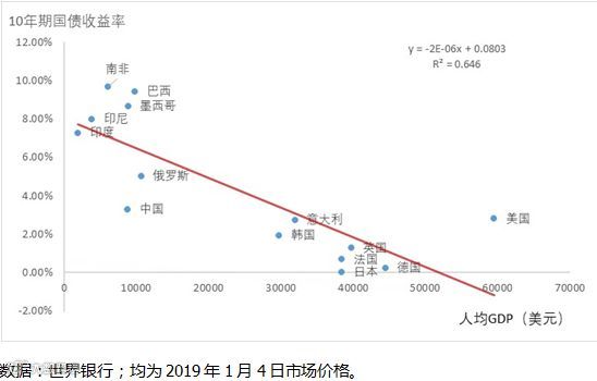 中国经济长期以来回报水平高于发达国家,拿十年期国债收益率对比如下。