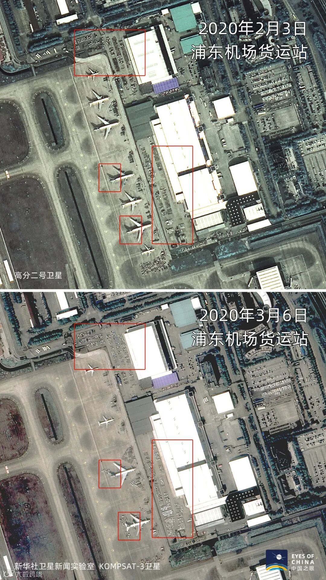 浦东机场货运站,2月3日多架停放在地面的飞机装卸货物迹象不明显。3月6日,地面停放飞机数量减少,且多在进行装卸作业,堆放的货物也大大增多。