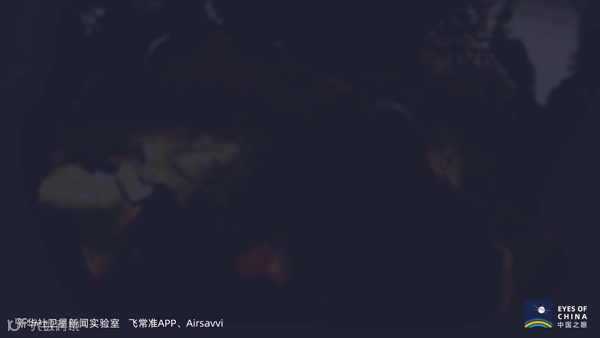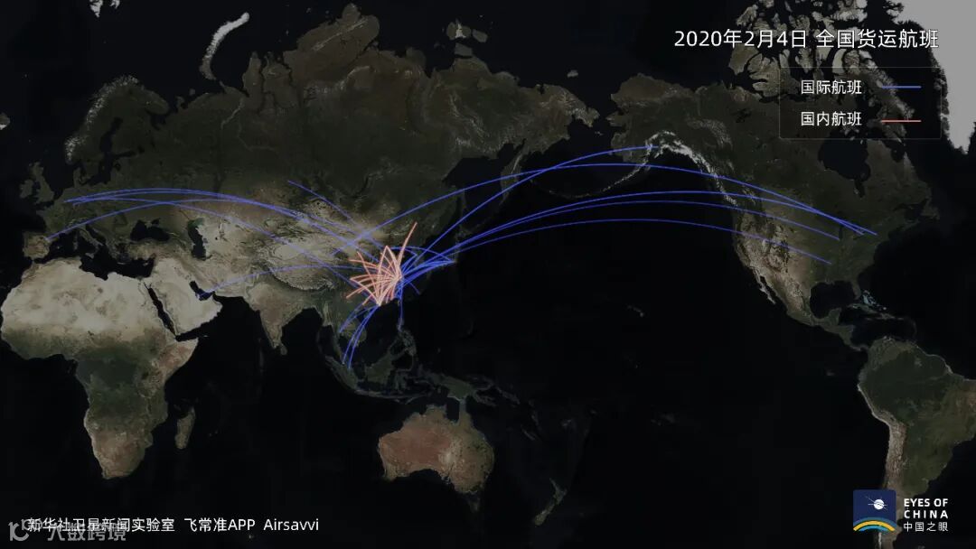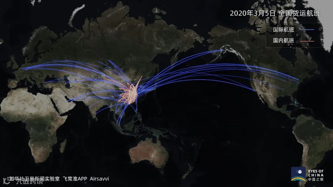 1个月内,中国国内和直飞世界各地的货运航班快速增多,原有航线航班数也有增加,标示航线的橘色、蓝色线条也就更粗。
