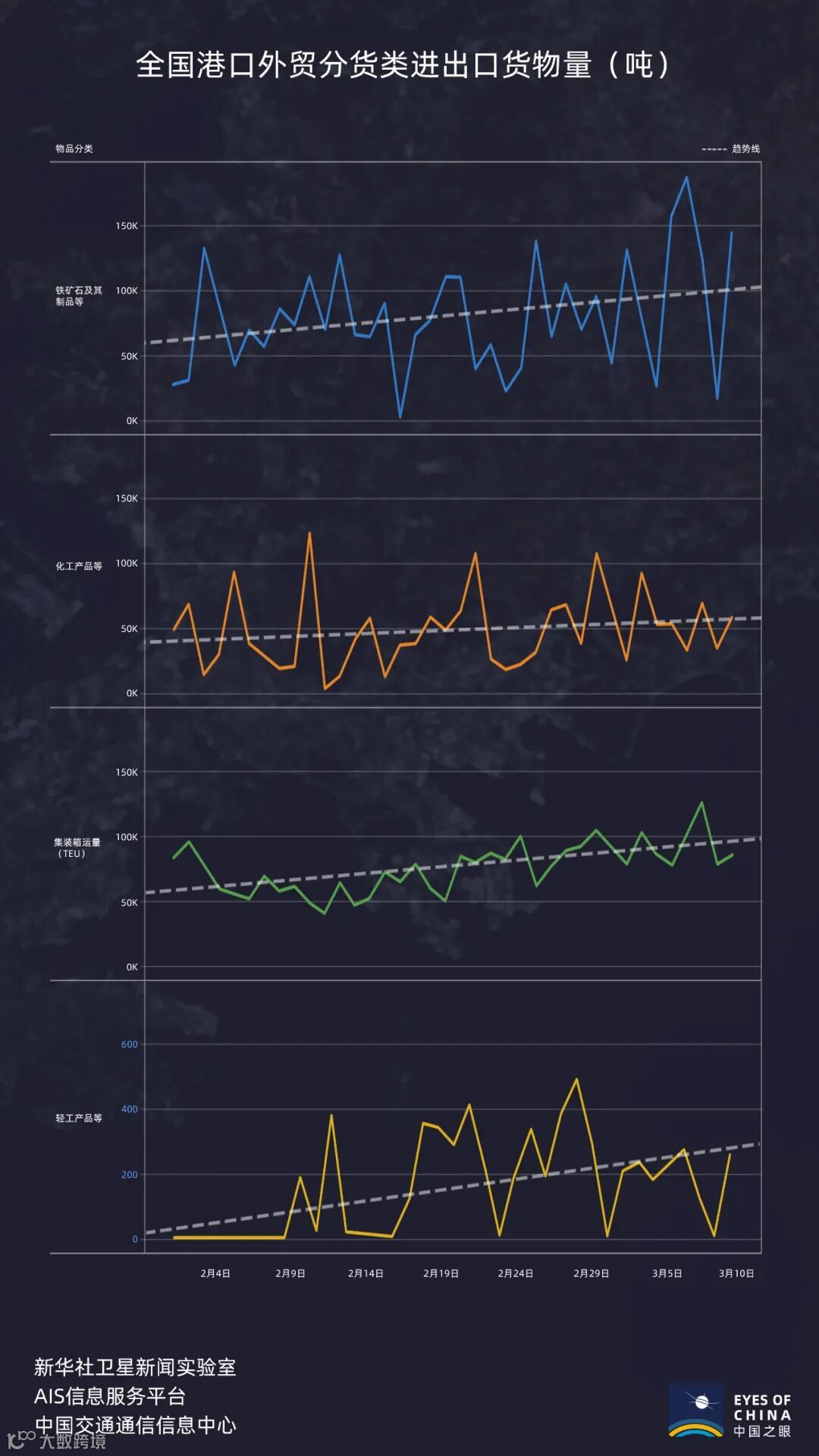 通过卫星等方式获得的中国沿海、内河船舶轨迹(不含港澳台地区),3月中旬相比2月下旬,渤海湾至长江口,以及北部湾区域,船舶航迹明显扩展,说明船舶出港、航行的活跃度大大提升。