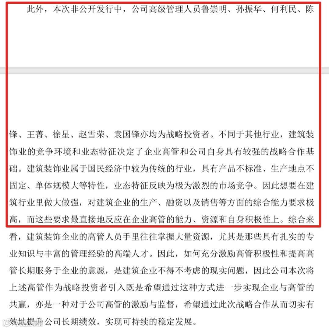 在柯利达案例中,对于8名公司高管的战略投资者论证,该公告解释,“建筑装饰企业的高管人员手里往往掌握大量资源,尤其是那些具有扎实的专业知识与丰富的管理经验的高端人才。”