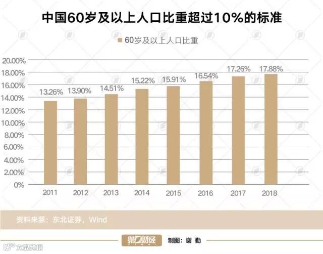我国人口老龄化趋势十分明显。2018 年,中国60岁以上人口所占比重已经达到 17.88%,近2.5亿人,65岁以上人口比重达到11.94%,约有1.68亿人。