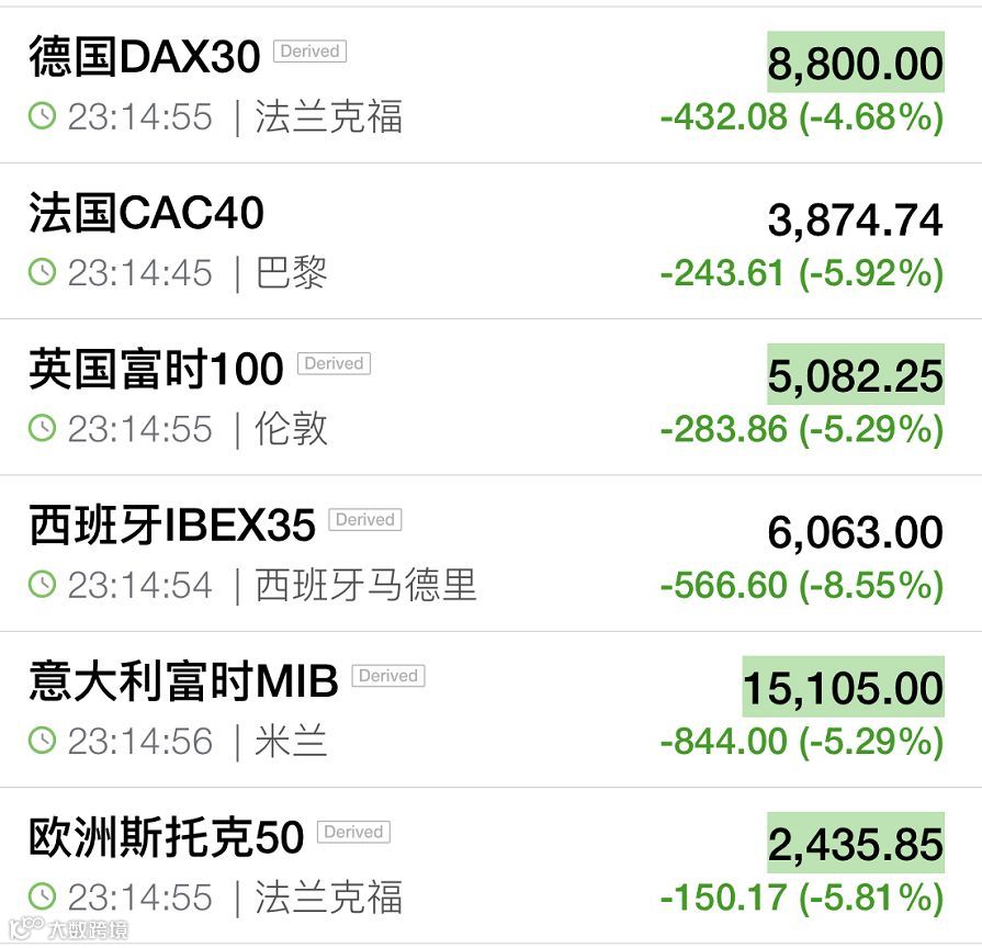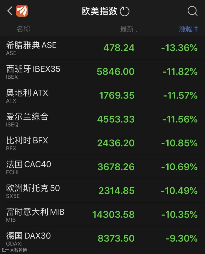 谁都不知道全球股市暴跌啥时候能够结束。欧股开盘后跌幅扩大,欧洲Stoxx600指数跌幅达10%,德国DAX指数跌近10%,英国富时100指数跌7.2%,法国CAC40指数、欧洲斯托克50指数跌超11%,意大利富时MIB指数跌超10%。