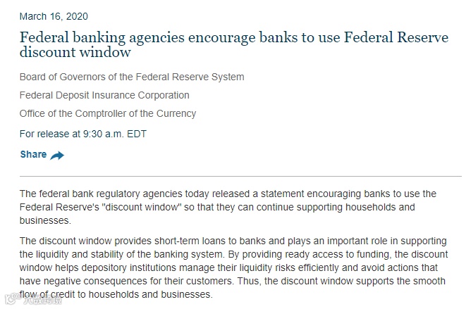 美联储紧急降息100个基点至0-0.25%的历史最低水平,并推出7000亿美元大规模QE计划。北京时间3月16日晚间,美联储系统理事会,联邦存款保险公司和货币主计长办公室发表联合声明,鼓励银行使用美联储的“折扣窗口”,以便它们可以继续为家庭和企业提供支持。贴现窗口向银行提供短期贷款,并在支持银行系统的流动性和稳定性方面发挥重要作用。通过提供现成的融资渠道,折扣窗口可帮助存款机构有效地管理其流动性风险,并避免采取对客户造成负面影响的行动。因此,折扣窗口支持信贷向家庭和企业的平稳流动。