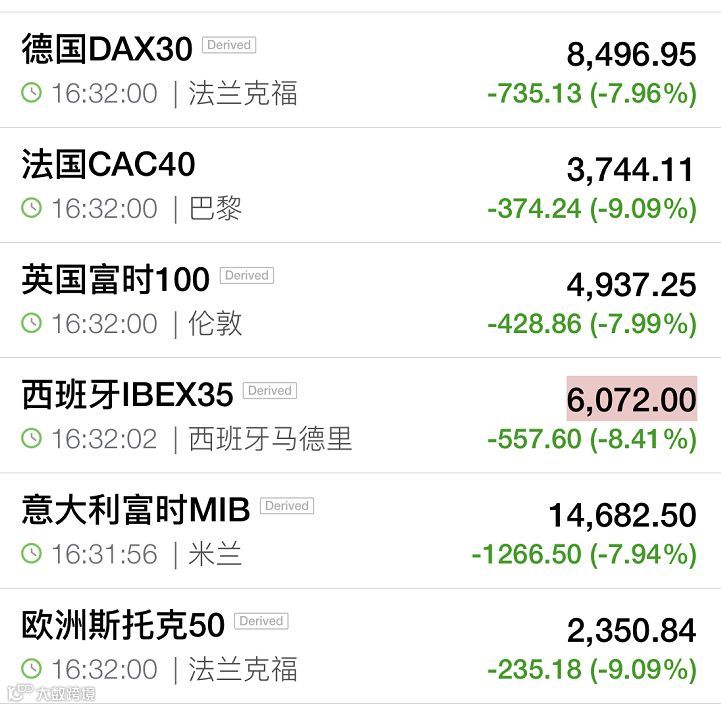 欧股集体低开,盘中持续走低,截至16:32,欧洲斯托克50指数大跌超9%,德国DAX指数跌近8%,英国富时100指数跌近8%,法国CAC40大跌超9%。