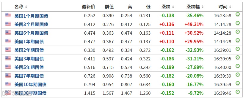 美债收益率跌至日低,十年期收益率一度跌20个基点至0.75%。