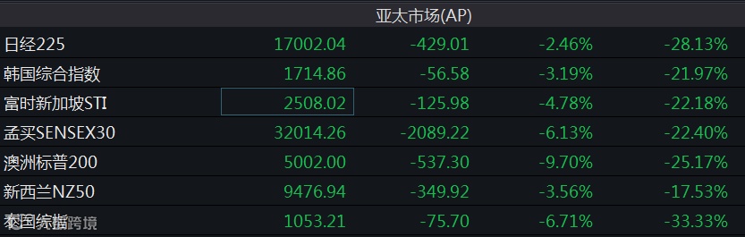欧股集体低开,盘中持续走低,截至16:32,欧洲斯托克50指数大跌超9%,德国DAX指数跌近8%,英国富时100指数跌近8%,法国CAC40大跌超9%。亚太股市全线收跌,日经225指数收盘跌2.46%,韩国综合股价指数收盘报1714.86点,下跌56.58点,跌幅达3.19%。