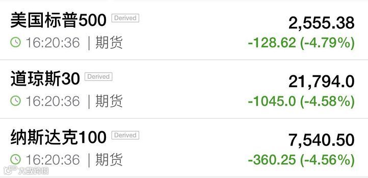 截至券商中国发稿,美国三大股指期货延续上午跌势,跌幅均超4.5%,其中道指4.58%,标普500指数期货跌幅逼近4.8%,纳指期货跌幅为4.56%。