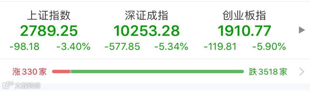 受此影响,A股也出现了大跌。截止收盘,沪指报2789.25点,跌3.40%,成交额为3756亿元;深成指报10253.28点,跌5.34%,成交额为5877亿元;创指报1910.77点,跌5.90%,成交额为2023亿元。从盘面上看,科技股、权重板块杀跌明显,两市超百只个股跌停。