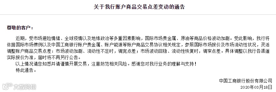 工行表示,受此影响,参照国际市场报价及市场流动性状况,该行将灵活调整账户商品交易点差:市场波动加剧、流动性不足时,调宽点差;市场波动回稳、流动性恢复时,调窄点差。