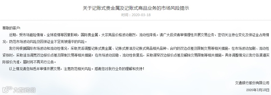 同样宣布将灵活调整账户贵金属及账户商品交易点差的还有建设银行、交通银行。