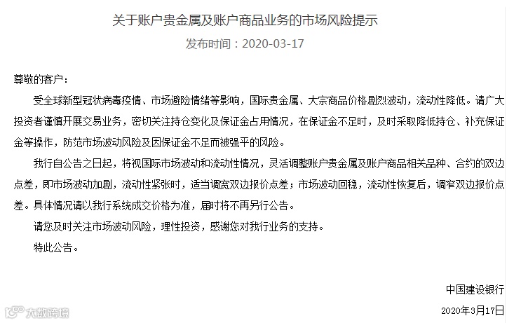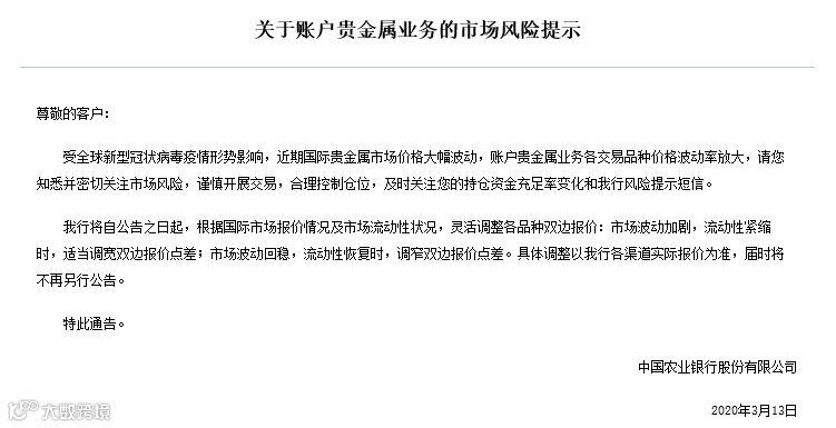 农业银行则在3月13日发布《关于账户贵金属业务的市场风险提示》,称:根据国际市场报价情况及市场流动性状况,灵活调整各品种双边报价。