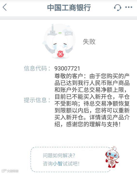 记者在下单确认时,工行APP客服提示称,“由于您购买产品已达到我行人民币账户商品和账户外汇总交易净额上限,目前已不能买入新开仓(做多),平仓不受影响;待总交易净额恢复到限额以内后,您将可以重新买入新开仓。”