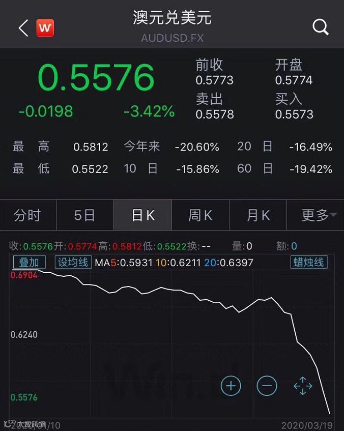 19日,澳元兑美元重挫4.6%,创2002年以来最弱水平。