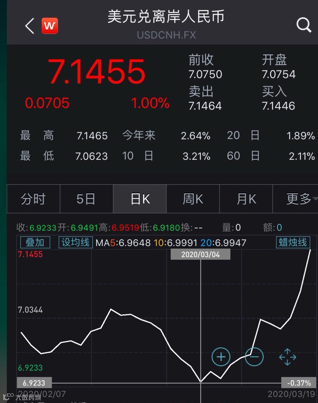 与此同时,美元指数的持续走强,对不少非美货币来说,将会面临着不小的被动贬值压力。人民币汇率在此背景下亦难独善其身,3月19日,离岸人民币对美元汇率一度跌幅扩大至1%,跌破7.14关口。自3月11日以来,在岸人民币兑美元汇率6个交易日已下跌超1500点。