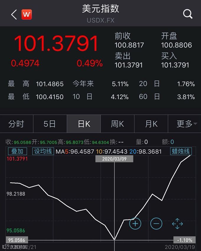 美股10天熔断4次,但美元指数却扶摇直上,持续走强。3月19日,美元指数强势突破101关口,目前已从3月9日的低点反弹近6.7%,10日之内上演V型大反转。