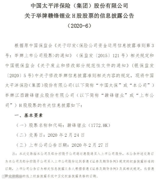 2月28日,中国太保在中国保险行业协会网站发布公告称,2月24日,太保集团及控股子公司太保产险、太保寿险、太保安联及安信农险通过港股通合计买入赣锋锂业H股股票240.52万股。本次举牌涉及资金约7535万港币,加上此前持股,太保集团及控股子公司持有赣锋锂业H股比例达到“举牌线”5.16%。