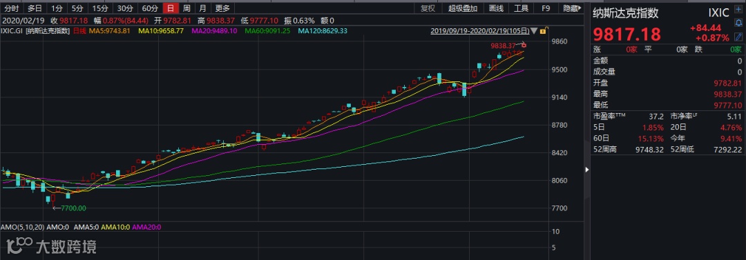 北京时间2月19日晚,道指收盘涨0.4%,报29348.03点;标普500涨0.47%,报3386.15点;纳指涨0.87%,报9817.18点。纳指和标普双双再创历史新高。盘面上,热门股特斯拉大涨近7%,英伟达6.11%。