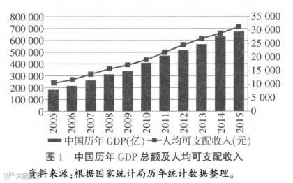 虽然我国老年服务市场消费潜力巨大,但潜力需求转化为有效需求关键在于人民生活水平,尤其是老年人生活水平的提高。如图l所示,2005~2015年,我国GDP总量和人均可支配收入逐年增加,GDP总量由最初的18.49万亿人民币增长到67.67万亿人民币.增长约为3.66倍。人均可支配收入由2005年的10493元增长到2015年的31195元,增长约3倍。
