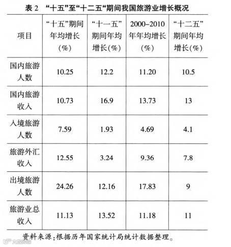 随着我国经济的发展,我国旅游产业也逐渐发展起来。据统计资料显示,“十五”至“十二五”期间。我国国内旅游人数、国内旅游收入和旅游总收入增长率都超过了10%以上(如表2所示)。尤其是“十二五”期间,我国旅游业发展迅猛,产品体系日益完善,旅游产业及增加值占GDP比重达到4.33%,逐渐成为我国新的经济增长点。随着我国互联网产业的发展,我国在线旅游市场发展较快,为旅游产业发展提供了新途径。