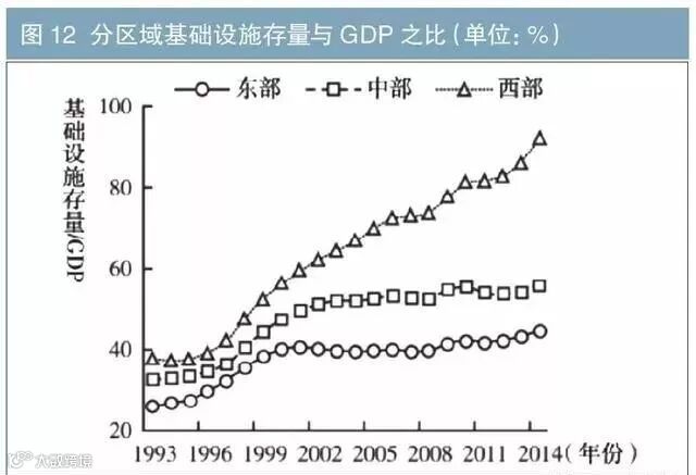 中国宏观杠杆率的攀升与基建投资占GDP比重的提高密切相关,这表明基建的投资效率有待提升。中国目前基建效率在空间布局上存在着较大的改进空间。西部地区基建投资过剩集中体现在传统的“铁公基”上。以公路和铁路为例,截至2014年,西部地区每万人公路里程48.7公里,高于中部地区的33.9公里和东部地区的21.5公里;西部地区1.18公里的每万人铁路运营里程也高于东、中部地区。铁路和公路的运营里程存在明显的和经济发展水平倒挂的现象,这反映的是政策面意图通过西部大开发等战略将基建投资等向西部地区倾斜,以缩小中国的区域差距乃至寻找新的经济增长极。大规模的基建投入的确改善了西部原本较为落后的基础设施现状,也是西部地区经济保持相对高增的重要推动力,但持续攀升的基础设施存量与GDP之比(见图12)表明西部地区基建增速或已超过与经济增速相适宜的水平。西部地区基础设施资本存量在总体过剩的同时,城市公共设施建设相比东部地区明显不足,人均城市道路长度、人均城市供水量和人均公共交通车辆等公共设施指标都低于东部地区。为此在当前的基建补短板中,西部地区应将更多资源转向污水处理、城市管廊、城市公共交通等与公共设施相关的政府类项目。同时,全国层面应适度调整基建资源过度向西部地区集中的现状。