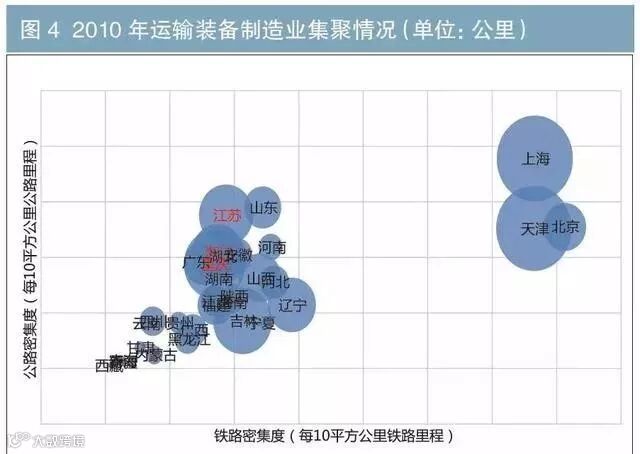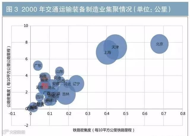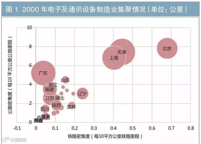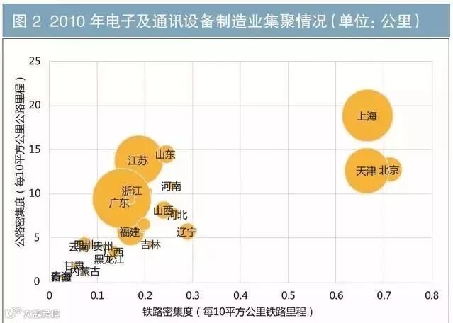 与发达国家不同,谈及中国的地方政府隐性债务,不可忽视的是中国地方政府在经济增长中扮演的独特角色。中国地方政府的企业化运作是中国经济增长的重要解释之一,这与中央、地方在经济上的分税制安排及GDP激励机制密切相关。其中,最重要的方面就是中国地方政府在基建上的投入。基础设施的完善极大改善了中国的投资环境。关于基建对经济增长正外部性的学术和实证都比较充分。特别值得关注的是,中国具备全球少有的较为完整的产业体系,在中国的产业集聚中,地方政府发挥了至关重要的作用。以克鲁格曼等为代表的新经济地理学派指出,产业集聚的重要因素有企业数量、人力资本、消费者购买力和交通运输条件。中国地方政府推动的招商引资、产业园区建设吸引了企业的集聚,人力资本的改善也来自于政府持续的教育资源投入,而产业配套和集聚能力与交通运输的改善更是密切相关。我们选取了两个行业,一个是出口导向的电子通信设备制造业,另一个是交通运输装备制造业,观察其区域产业集聚与铁路公路密度的关系,用气泡的大小来反映其产业聚集度,气泡越大,表明产业聚集水平越高。图1至图4显示,从2000年到2010年,除了北京以外,其他省份的产业聚集度与其交通条件正相关,广东、浙江和江苏的这种相关性尤为显著。