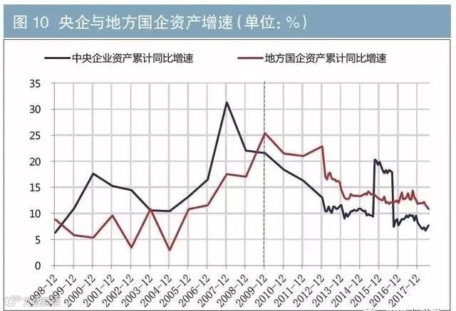 今年以来,市场比较多地在讨论“国进民退”。事实上,如果进一步细分数据,可以看到“国进民退”突出的表现为地方国企的“进”。中国企业杠杆率主要高在地方国企。杠杆率从总量上来看的确并不显著的高,但其问题在于地方政府及国企的债务高企。2009年之后,中国国有企业数量急剧增加,尽管国资委直管央企的数量在减少,但基于地方政府信用扩张的地方国企的数量是显著膨胀的。从2009年开始,地方国企的资产增速达25%左右,即便在2011年后有所下降,但明显高于央企和其自身的历史水平(见图10)。