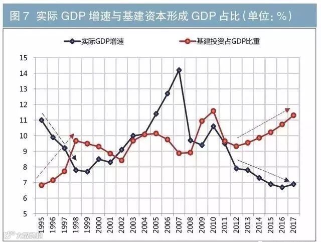 尽管基建在中国经济增长中发挥了很大的积极作用,但这一作用在2012年之前更为明显,此后其效率明显下滑。图7显示,2012年之后,基建投资占GDP比重不断攀升,但经济增速却持续走低。