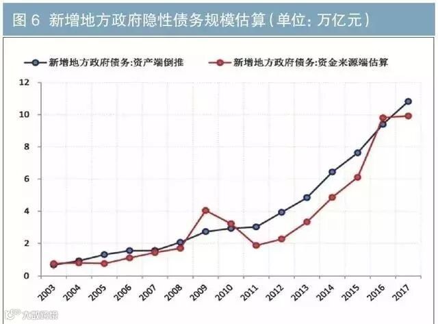 当然,在基建上的巨大投入也形成了债务的快速增长,特别是隐性债务的增长,进而使得中国的宏观杠杆率较高。根据国际货币基金组织(IMF)的估算,截至2017年底中国地方政府隐性债务约为24.8万亿元(见图5)。我们从资产端和资金端分别进行了估算,2015—2017年新增的地方政府隐性债务约为26万亿元(见图6),考虑到资产端形成的跨年度性,估计实际形成的隐性债务约为30万亿元。