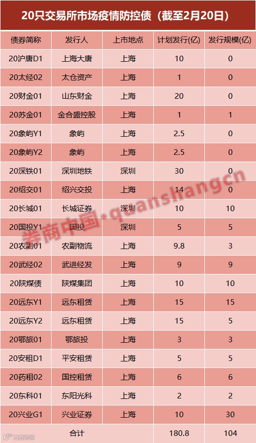 与此同时,沪深交易所市场共发行了20只疫情防控债的发行,计划发行规模约合180.8亿元,已发行规模104亿元。