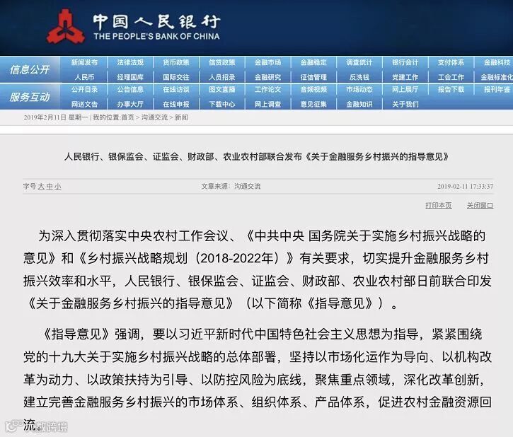 人民银行、银保监会、证监会、财政部、农业农村部联合发布《关于金融服务乡村振兴的指导意见》