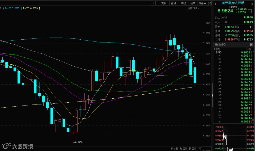 在近期全球股市动荡不安的背景之下,离岸人民币却在持续上涨。近6个交易日,离岸本币从6天前的最高位7.0565至今日的最低点,升值近1000点。分析人士认为,这可能与美元近期持续贬值有关。