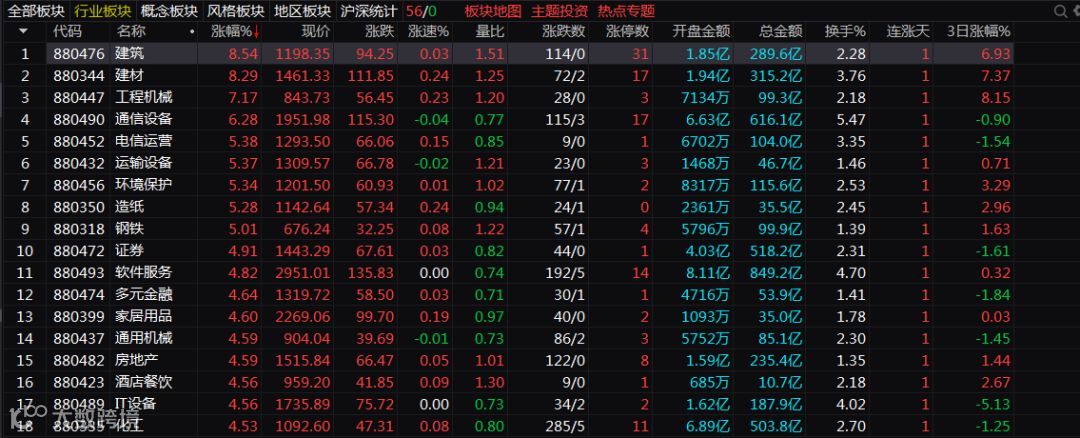 不单指数在涨,行业板块也全线反弹。建筑、建材、工程机械全线上涨,以5G为主体的通信设备、电信运营亦涨幅居前。这几个板块都在周末出现过一些利好。