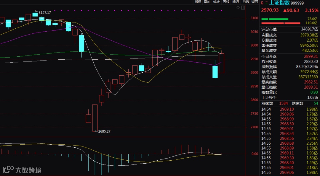 3月2日,A股市场高开高走,三大股指均收涨逾3%,沪指收涨逾90点,单日几乎填补上一交易日百点跌幅砸出的大坑。行业指数全线飘红,大基建板块强势领涨,两市成交额连续9日超万亿。北上资金亦一反前期连续净卖出的势头,今日净买入A股逾41.52亿元。