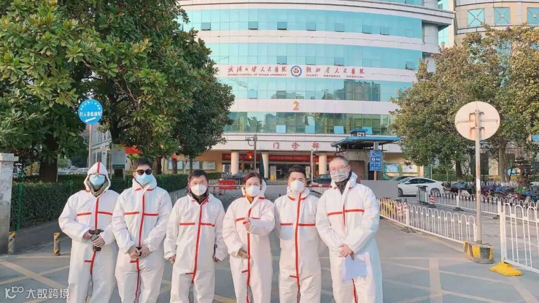 图为孟庆夔(右一)在支援湖北省人民医院,图中均为海归志愿队成员