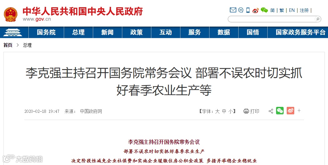 据中国政府网,国务院总理李克强2月18日主持召开国务院常务会议,部署不误农时切实抓好春季农业生产;决定阶段性减免企业社保费和实施企业缓缴住房公积金政策,多措并举稳企业稳就业。而就在此前一周,李克强总理主持召开国务院常务会议时强调,要在全力以赴抓好疫情防控同时,分类有序推动企业复工复产。