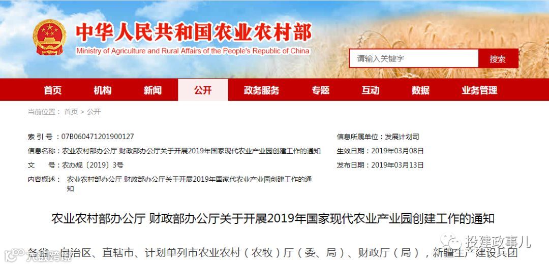 根据中央农村工作会议、2019年中央1号文件关于推进现代农业产业园建设的部署要求,农业农村部、财政部决定2019年继续开展国家现代农业产业园(以下简称“产业园”)创建工作,现将有关事项通知如下。