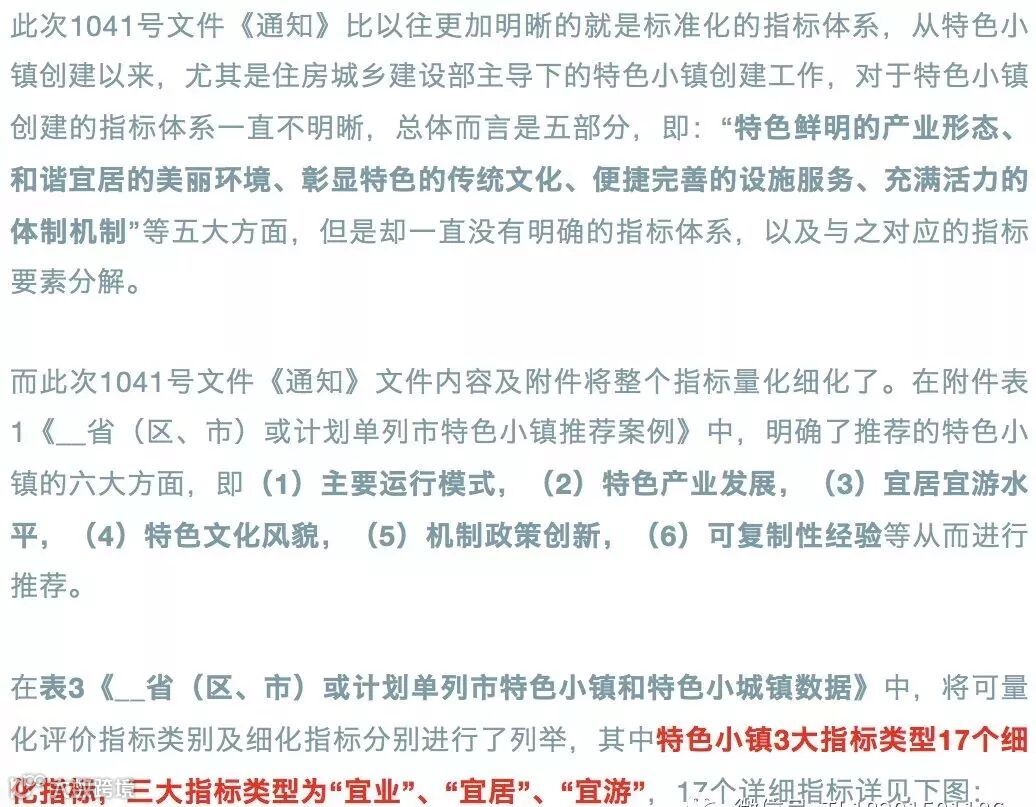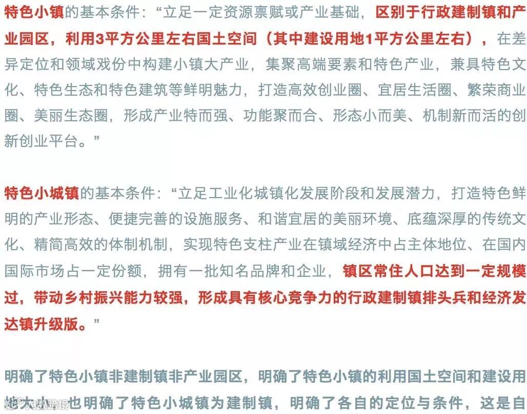 此次1041号文件《通知》另一个亮点就是明确了典型特色小镇和特色小城镇的条件,以往的特色小镇创建中,特色小镇和特色小城镇的标准是模糊的,没有明确的进行界定。此前住房城乡建设部《关于开展特色小镇培育工作的通知》并未对特色小镇的条件、范围、大小进行界定,直至国家发改委2016年12月《国家发展改革委关于加快美丽特色小(城)镇建设的指导意见》发改规划〔2016〕2125号提出:“以镇区常住人口5万以上的特大镇、镇区常住人口3万以上的专业特色镇为重点,兼顾多类型多形态的特色小镇,因地制宜建设美丽特色小(城)镇。” 四部委联合印发的《关于规范推进特色小镇和特色小城镇建设的若干意见》(发改规划〔2017〕2084号中明确特色小镇“规划用地面积控制在3平方公里左右,其中建设用地面积控制在1平方公里左右,旅游、体育和农业类特色小镇可适当放宽”,但仍未区分特色小镇与特色小城镇,本次1041号文件,明确了特色小镇、特色小城镇的基本条件,这是又一大亮点。
