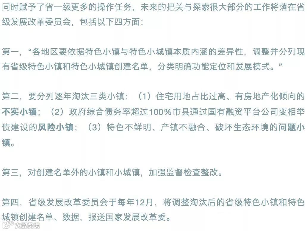 区别于以往的命名制一旦获得称号,一般不会摘除,创建达标制实行的是动态考核机制,《通知》明确提出“坚决淘汰一批缺失产业前景、变形走样异化的小镇和小城镇”。“统一实行有进有退的创建达标制,避免一次命名制,防止各地区只管前期申报、不管后期发展与纠偏。”