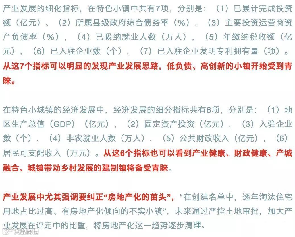 关注产业,关注产业健康发展,这一点在特色小镇和特色小城镇的数据表里面可以明显看到。特色小镇的指标类型排列中,“宜业”放在首位,“宜居”排在第二位,“宜游”排在第三位,而在特色小城镇数据指标类型中“经济发展”放在首位,“公共服务”放在第二位,“绿色生态”放在第三位,这就与之前三部委《关于开展特色小镇培育工作的通知》文件中“休闲旅游、商贸物流、现代制造、教育科技、传统文化、美丽宜居”的排位顺序完全不同了,因此产业优先成为了这次1041号文件《通知》的关键导向,之前许多地方将特色小镇建设解读为旅游休闲小镇建设的错误将不会再出现。