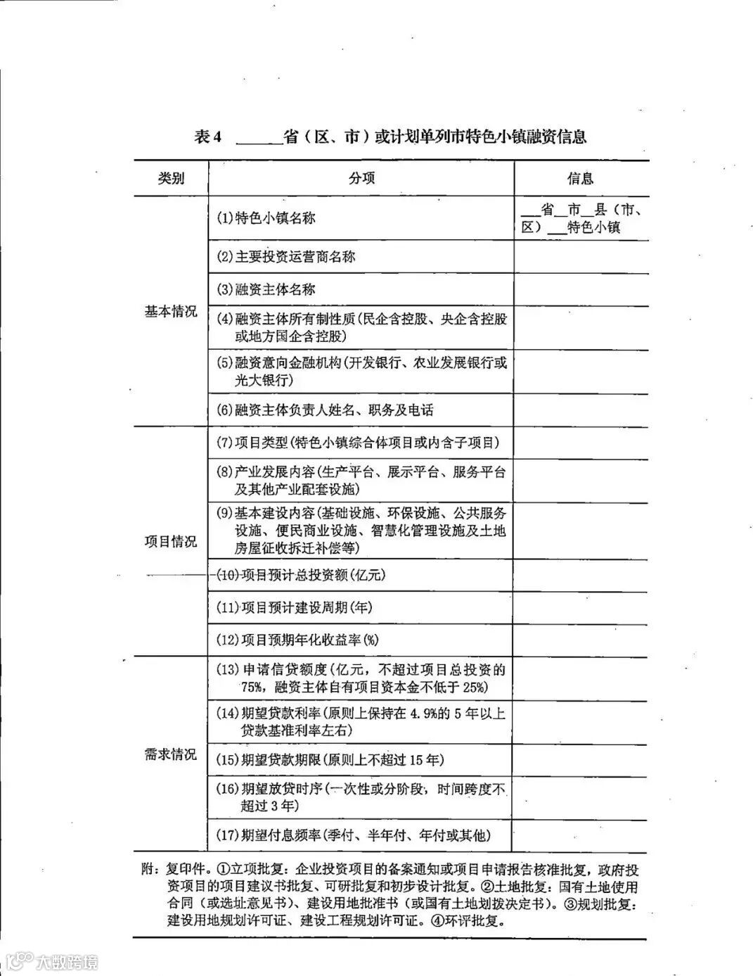 在附件表4《__省(区、市)或计划单列市特色小镇融资信息》中,有对特色小镇建设的融资需求情况的调研了解,包括申请信贷额度、期望信贷利率、期望贷款期限、期望放贷时序、期望付息频率等方面的信息,国家通过相关的银行机构支持特色小镇发展。