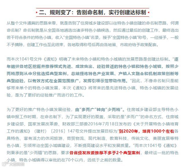 此次1041号文件《通知》另一个亮点就是明确了典型特色小镇和特色小城镇的条件,以往的特色小镇创建中,特色小镇和特色小城镇的标准是模糊的,没有明确的进行界定。此前住房城乡建设部《关于开展特色小镇培育工作的通知》并未对特色小镇的条件、范围、大小进行界定,直至国家发改委2016年12月《国家发展改革委关于加快美丽特色小(城)镇建设的指导意见》发改规划〔2016〕2125号提出:“以镇区常住人口5万以上的特大镇、镇区常住人口3万以上的专业特色镇为重点,兼顾多类型多形态的特色小镇,因地制宜建设美丽特色小(城)镇。” 四部委联合印发的《关于规范推进特色小镇和特色小城镇建设的若干意见》(发改规划〔2017〕2084号中明确特色小镇“规划用地面积控制在3平方公里左右,其中建设用地面积控制在1平方公里左右,旅游、体育和农业类特色小镇可适当放宽”,但仍未区分特色小镇与特色小城镇,本次1041号文件,明确了特色小镇、特色小城镇的基本条件,这是又一大亮点。