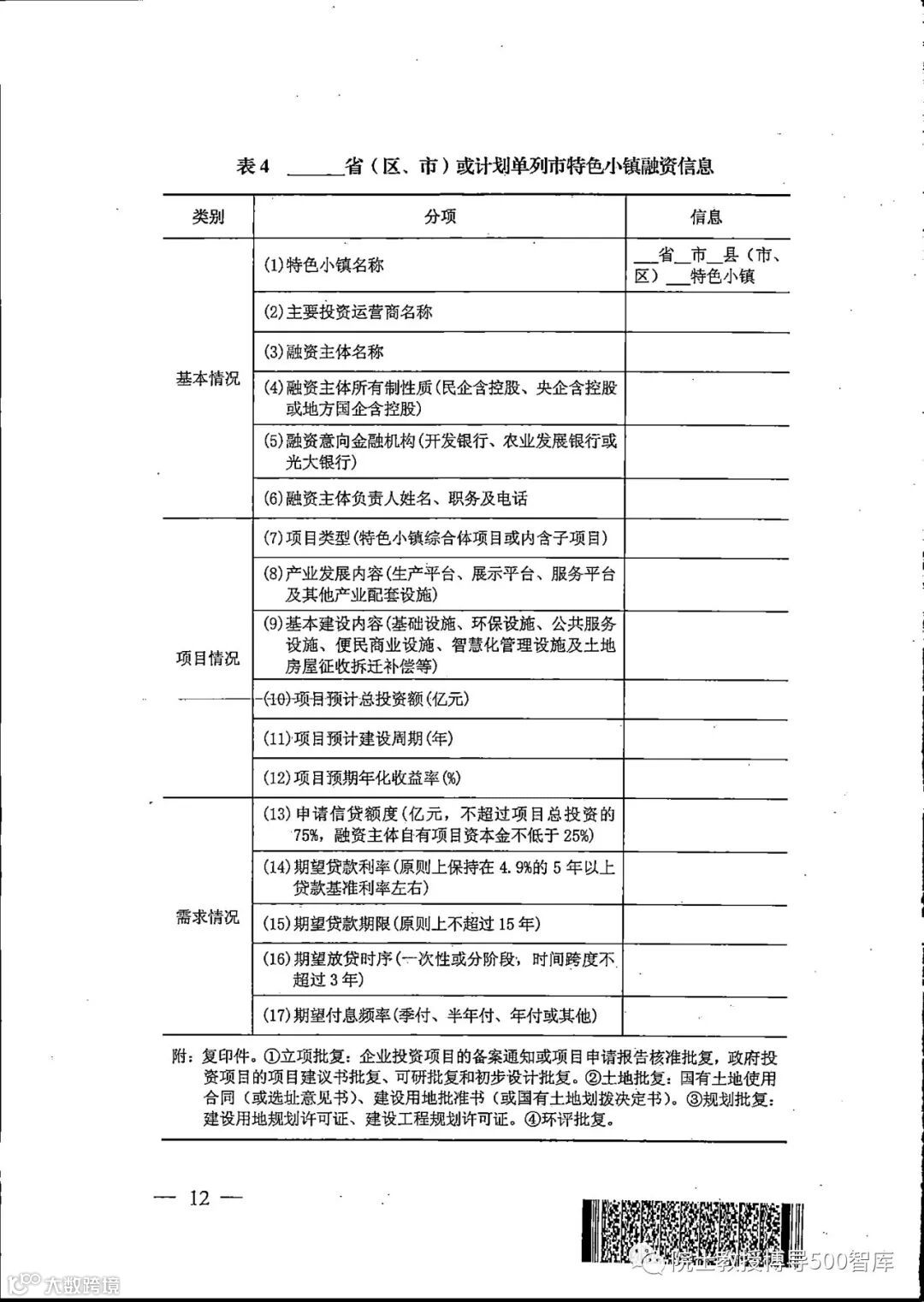 还通过附件表4《__省(区、市)或计划单列市特色小镇融资信息》对特色小镇的融资情况进行全面的摸排,严防前期特色小镇建设发展中出现的金融风险,对投资运营商、融资主体、融资意向金融机构、项目类型、产业发展内容、基本建设内容、预计总投资、预计建设周期、预期年化收益率等需要充分了解,从项目之初严防项目风险。