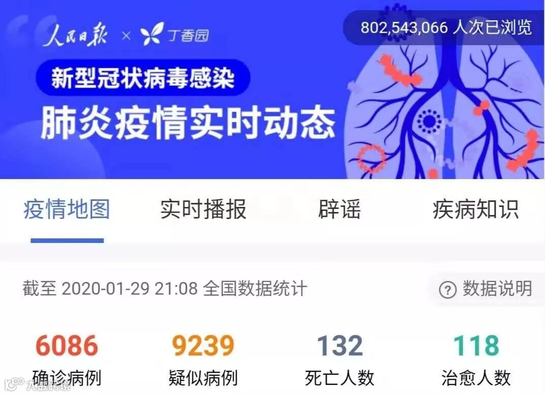 根据人民日报、丁香医生实时动态,截至1月29日21时08分,全国累计报告新型冠状病毒肺炎确诊6086例,疑似病例9239例,累计治愈出院118例。