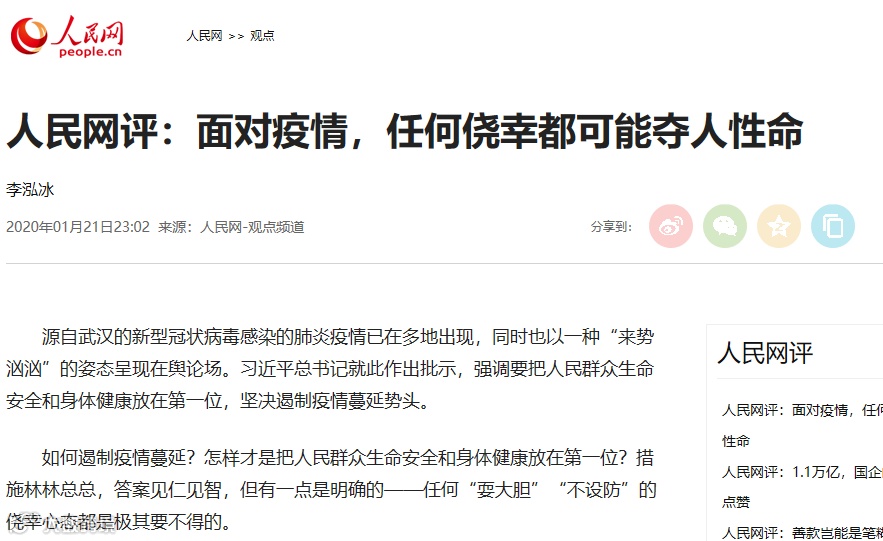 1月21日深夜,人民网刊发名为《面对疫情,任何侥幸都可能夺人性命》的评论文章。文章指出,源自武汉的新型冠状病毒感染的肺炎疫情已在多地出现,同时也以一种“来势汹汹”的姿态呈现在舆论场。如何遏制疫情蔓延?怎样才是把人民群众生命安全和身体健康放在第一位?措施林林总总,答案见仁见智,但有一点是明确的——任何“耍大胆”“不设防”的侥幸心态都是极其要不得的。