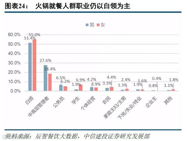 从受众性别看,女性比例高于男性,达到58%。从受众职业来看,50%以上的火锅消费者为白领。由于传统火锅社交属性较强,交流氛围热烈,中高端火锅正逐渐成为商务聚餐的新趋势。